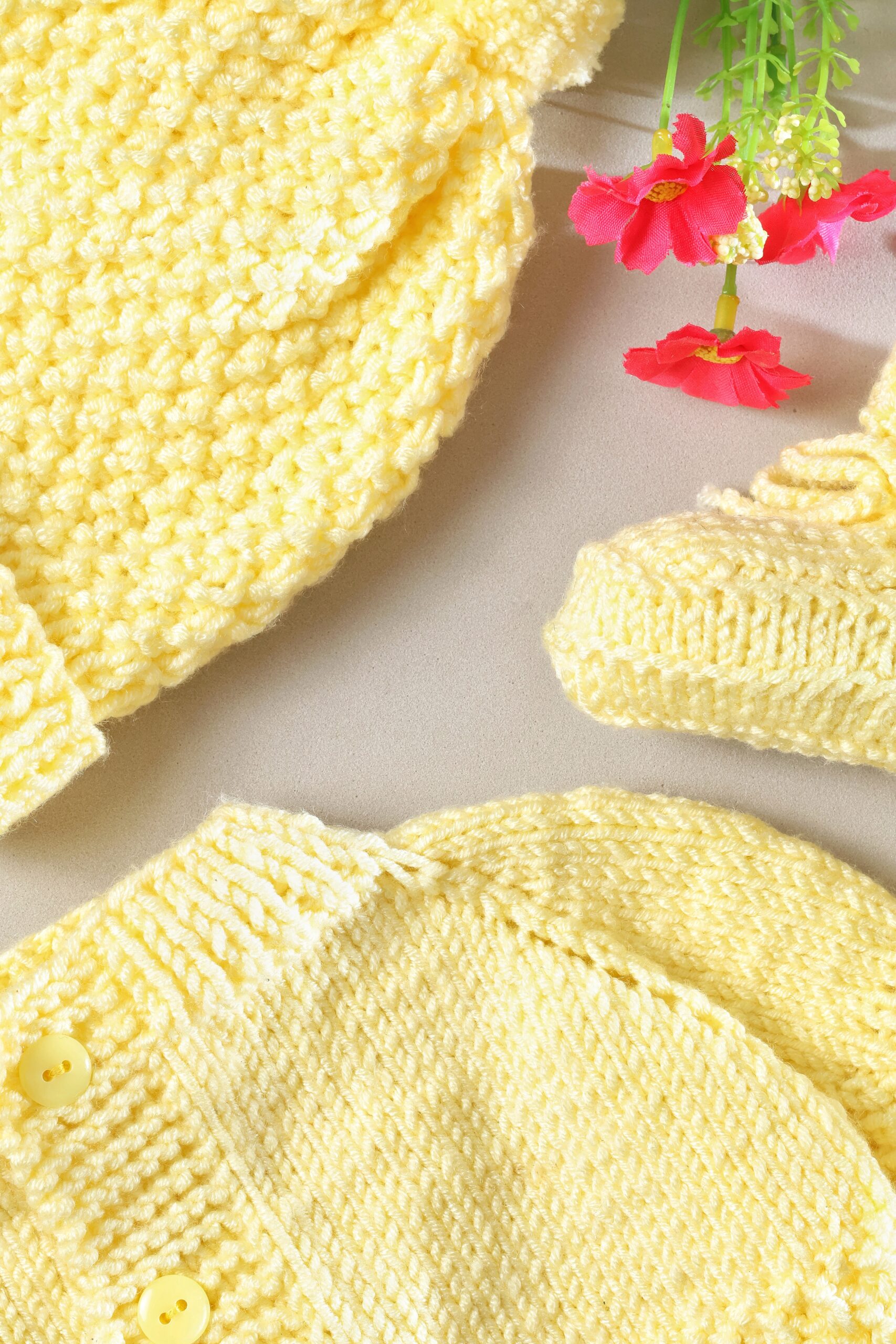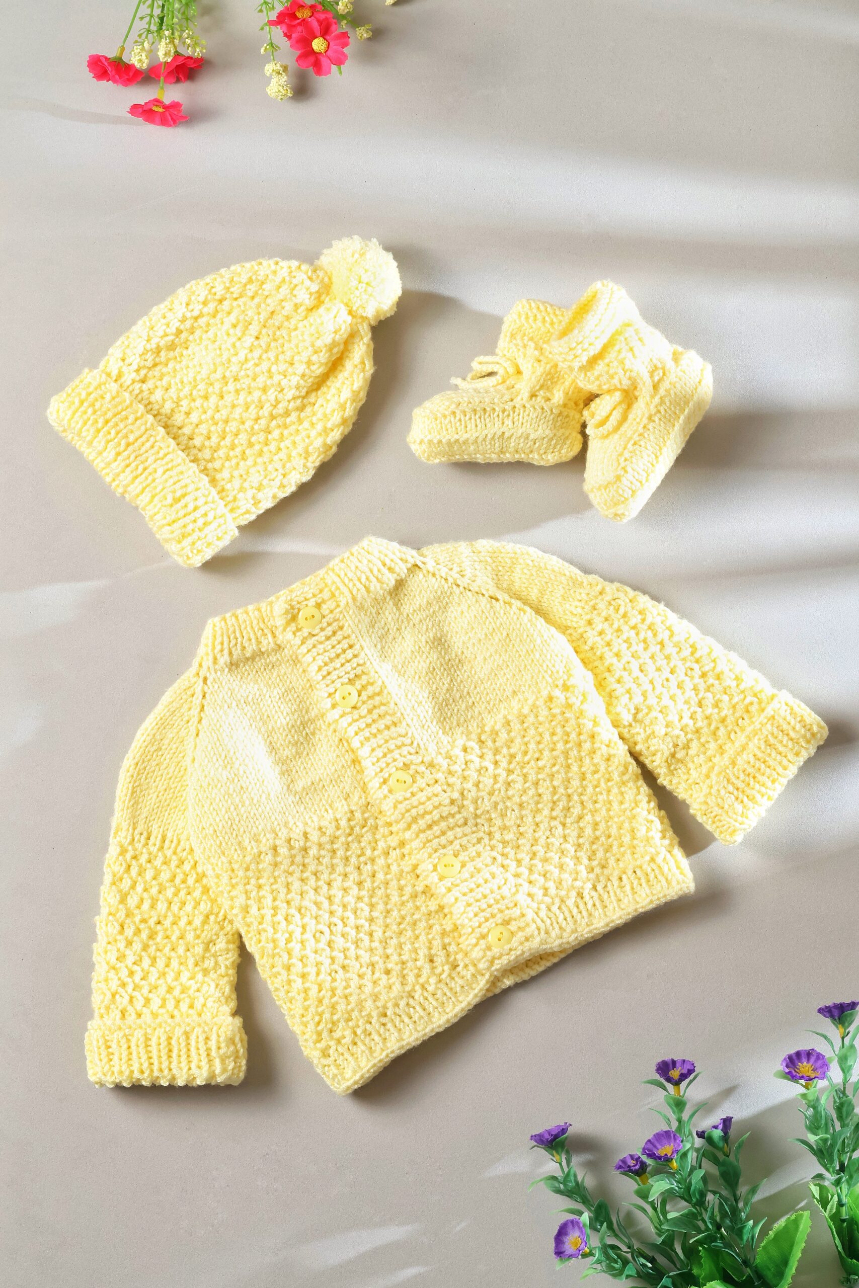 Saco amarillo para recien nacido, con botones del mismo tono, gorro y patines de caña alta color amarillo.